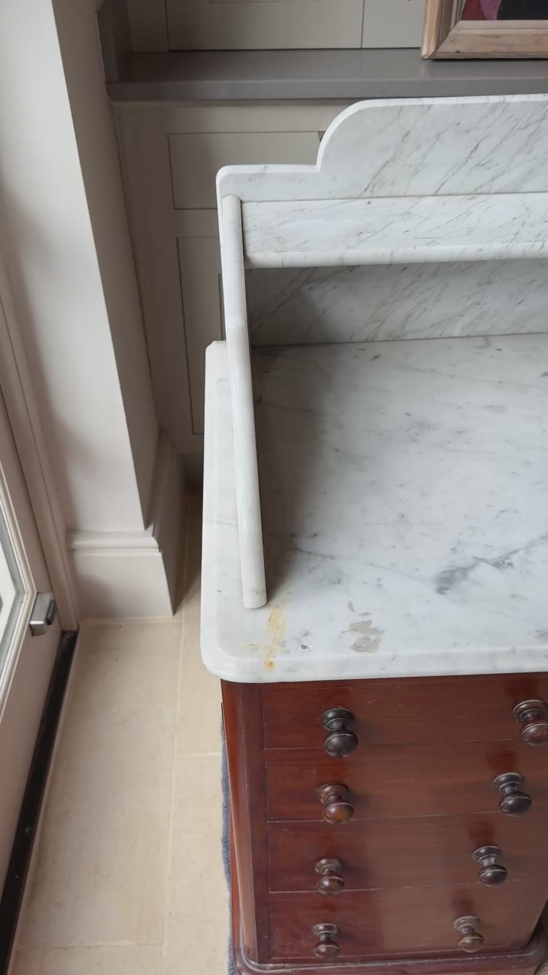 A superb 19th Century washstand with an original galleried marble top. It sits on castors. There are a few tiny holes and light staining to the marble. This would make a beautiful bathroom vanity in a modern bathroom. Really stunning with lots of storage.