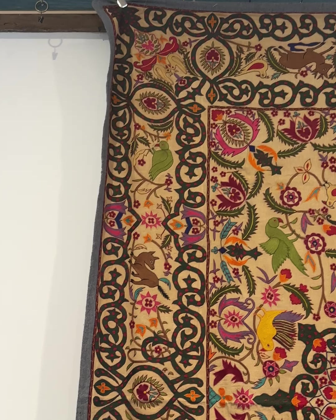 Amazing Vintage Indian Flora and Fauna Pishwai (wall hanging). In very good condition with very fine embroidery. Has a smart denim colour linen backing and border.