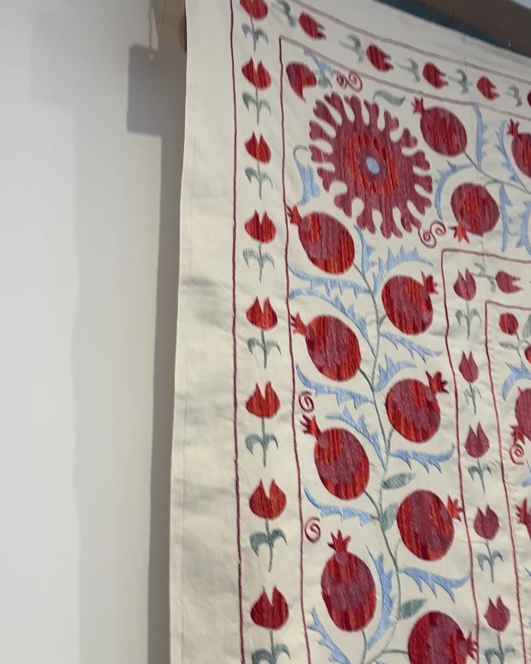 Ivory cotton with reds, blues and pinks and the pomegranate motif. This would make an ideal bed cover or table cloth. Enquire if you would like to commission a bespoke headboard or coffee table.